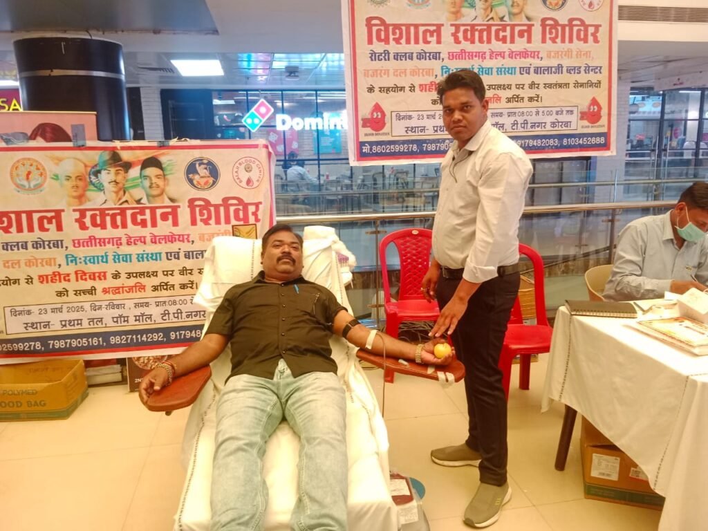 कोरबा। पाम मॉल में रविवार को सुबह 10 बजे से रक्त दान शिविर का आयोजन किया गया है जो शाम 6 बजे तक चलेगा। शिविर का आयोजन रोटरी क्लब, छत्तीसगढ़ हेल्थ वेलफेयर, बजरंग दल, बजरंगी सेना, नि:स्वार्थ सेवा संस्थान एवं बालाजी ब्लड बैंक के सहयोग से शहीद दिवस के उपलक्ष पर वीर स्वतंत्रता सेनानियों को सच्ची श्रद्धांजलि अर्पित करने के लिए किया गया। शिविर में 12 बजे तक 70 यूनिट रक्त इक्ट्ठा किया जा चुका है। आयोजन समिति ने बताया कि लोगों द्वारा रक्त दान करने से दिल की सेहत में सुधार, दिल की बीमारियों और स्ट्रोक के खतरे को कम माना जाता है। खून में आयरन की ज्यादा मात्रा दिल के दौरे के खतरे को बढ़ा सकती है। नियमित रूप से रक्तदान करने से आयरन की अतिरिक्त मात्रा नियंत्रित हो जाती है। जो दिल की सेहत के लिए अच्छी है। उन्होंने बताया कि कई बार मरीजों के शरीर में खून की मात्रा इतनी कम हो जाती है कि उन्हें किसी और व्यक्ति से ब्लड लेने की आवश्यकता पड़ जाती है। ऐसी ही इमरजेंसी स्थिति में खून की आपूर्ति के लिए लोगों को रक्तदान करने के लिए आगे आना चाहिए। इससे जरुरत मंद की मदद हो सकेगी।