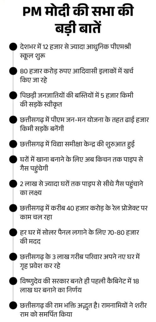 मोदी ने कहा कि हम आदिवासी समाज के विकास के लिए भी विशेष अभियान चला रहे हैं। हमने आपके लिए धरती आबा जनजातीय उत्कर्ष अभिायन शुरू किया है। इसके तहत 80 हजार करोड़ रुपए आदिवासी इलाकों में खर्च किए जा रहे हैं। इससे छत्तीसगढ़ के करीब 7 हजार आदिवासी गांवों को फायदा हो रहा है।