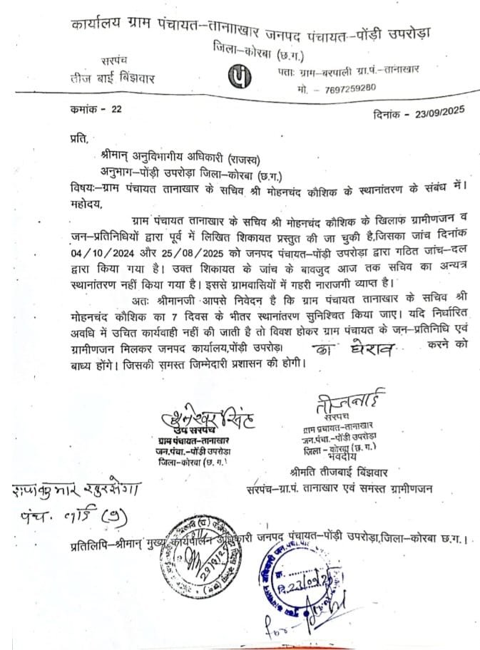 कोरबा/पोड़ी-उपरोड़ा। जिले की जनपद पंचायत पोड़ी-उपरोड़ा अंतर्गत ग्राम पंचायत तानाखार के सचिव मोहन कौशिक की हठधर्मिता और मनमानी के खिलाफ पंचायत प्रतिनिधियों एवं ग्रामीणों का आक्रोश लगातार बढ़ता जा रहा है। आज सरपंच तीजबाई, उपसरपंच भुनेश्वर सहित पंचगणों ने पोड़ी-उपरोड़ा एसडीएम को ज्ञापन सौंपा और एसडीएम से मांग की कि सचिव मोहन कौशिक को एक सप्ताह के अंदर यहां से हटाएं। एसडीएम ने आश्वासन दिया है, लेकिन पंचायत प्रतिनिधियों ने सात दिन का अल्टीमेट भी दिया है और एसडीएम से कहा है-यदि सचिव मोहन कौशिक सात दिन के अंदर यहां से नहीं हटाए जाते तो जनपद पोड़ी-उपरोड़ा कार्यालय का घेराव किया जाएगा।