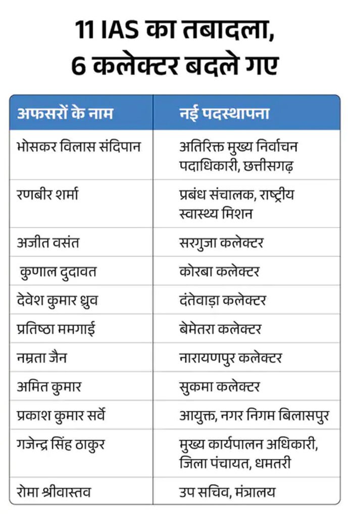 छत्तीसगढ़ में 11 IAS का तबादला…6 जिलों के कलेक्टर बदले:भोसकर विलास बनाए गए अतिरिक्त मुख्य निर्वाचन अधिकारी, अजीत सरगुजा और कुणाल कोरबा कलेक्टर बने