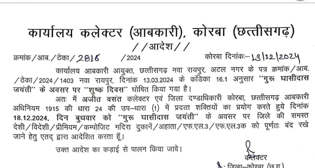 कोरबा। कलेक्टर एवं जिलादंडाधिकारी कोरबा ने आदेश जारी कर 18 दिसंबर दिन बुधवार गुरू घासीदास जयंती के अवसर पर शुष्क दिवस घोषित किया गया है। 18 दिसंबर को जिले की समस्त देशी/ विदेशी/ प्रीमियम/ कम्पोजिट मदिरा दुकानें / अहाता/ एफएल 3/ एफएल 3 क को पूर्णत:बंद रखने का आदेश जिला दंडाधिकारी ने दिया है।