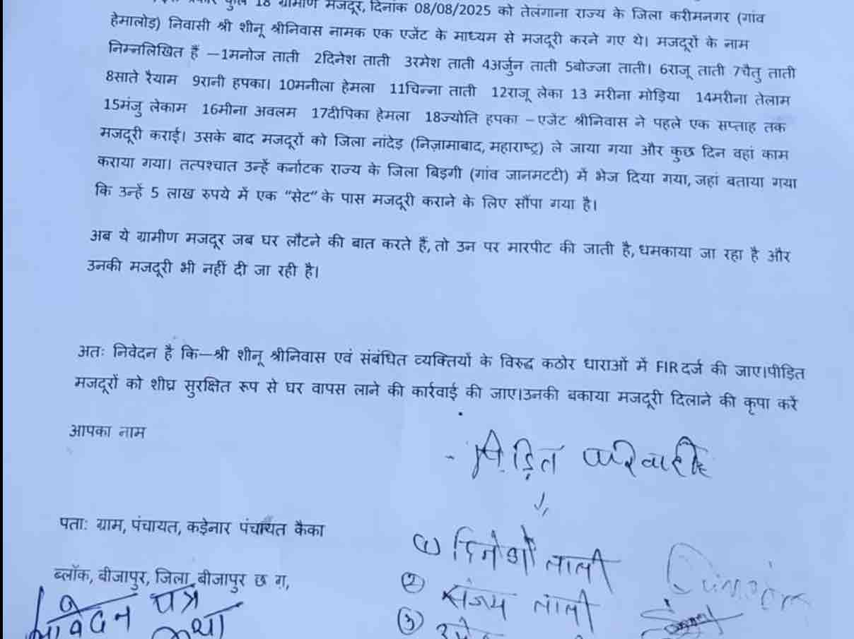 मजदूरों के परिजनों ने शिकायत में बताया कि जब भी मजदूर अपने गृह राज्य छत्तीसगढ़ लौटने की बात करते हैं, तो ठेकेदार उनके साथ मारपीट करता है और उन्हें धमकाता है। उन्हें उनकी मजदूरी भी नहीं दी जा रही है और उनका लगातार उत्पीड़न किया जा रहा है।