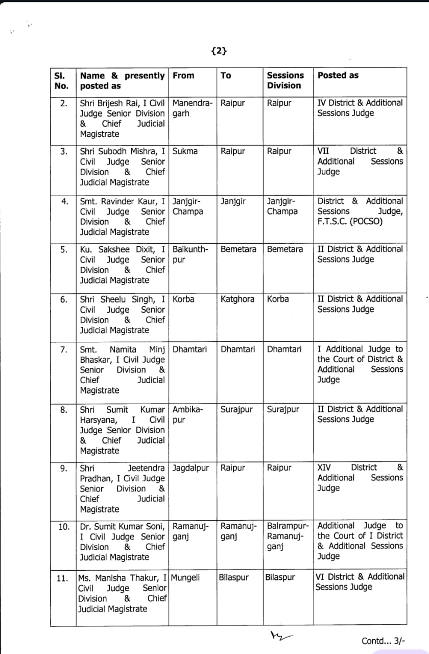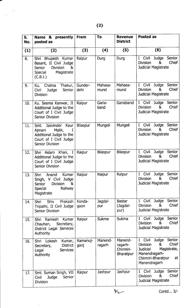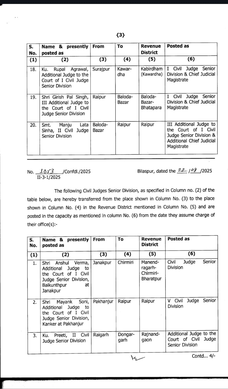 इसी तरह हाईकोर्ट ने जूनियर डिवीजन के तीन सिविल जजों का भी ट्रांसफर किया है, जिसमें सारंगढ़ में पदस्थ सिविल जज ध्रुवराज ग्वाल को कांकेर के पखांजूर भेजा गया है। वहीं, मुंगेली में पदस्थ सिविल जज श्वेता ठाकुर का तबादला बस्तर जिले के बचेली में किया गया है। इसी तरह राजनांदगांव में पदस्थ सिविल जज योगिता कंवर को बैकुंठपुर के जनकपुर भेजा गया है।