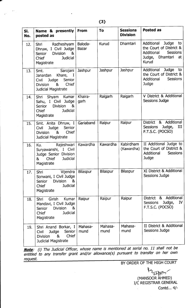 बता दें कि राज्य शासन ने 12 अगस्त को 19 सीनियर सिविल जजों को प्रमोशन देने का आदेश जारी किया है। प्रमोशन और नियुक्ति देने के साथ ही हाईकोर्ट से उनकी पोस्टिंग आदेश जारी करने की अनुशंसा की गई, जिस पर हाईकोर्ट के रजिस्ट्रार जनरल मंसूर अहमद ने शुक्रवार को इन अफसरों का पदस्थापना आदेश जारी किया है।