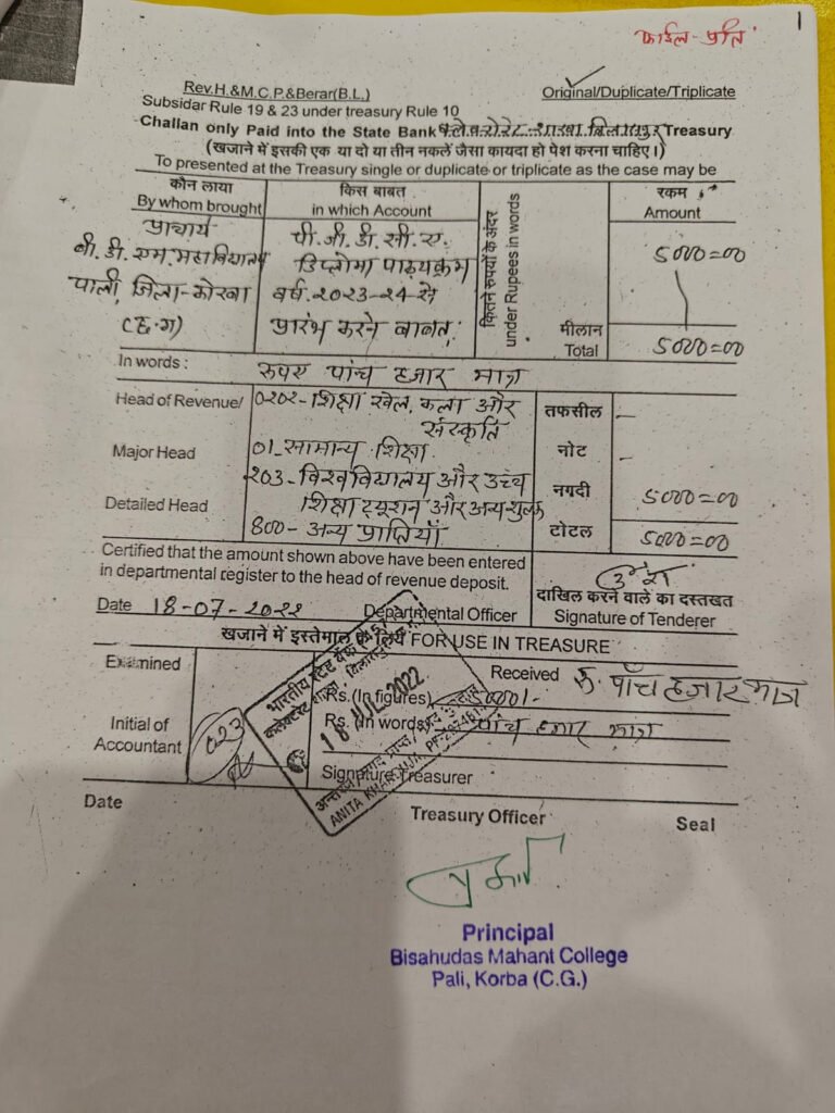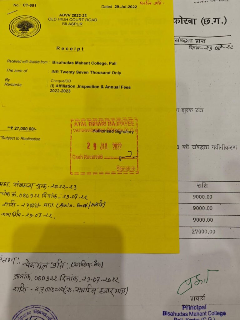 सत्र 2023-24 के लिए बीडीएम कॉलेज प्रबंधन ने 29 जुलाई 2022 को सम्बद्धता शुल्क की राशि 27 हजार जमा की है और ड्राप्ट के माध्यम से युनिवर्सिटी को उक्त राशि जमा की है।