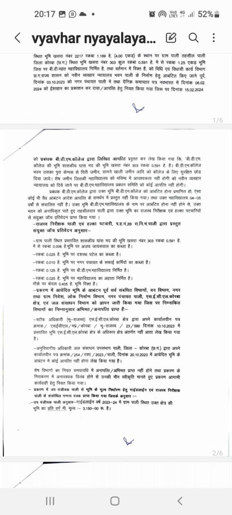 कोरबा/पाली। पाली-तानाखार विधानसभा क्षेत्र का सबसे पुराना एवं पाली ब्लाक मुख्यालय में स्थित 25 साल पुराना बीडीएम कॉलेज का क्या अब अस्तित्व मिट जाएगा। प्रशासन ने बीडीएम कॉलेज की करीब एक एकड़ जमीन को कोर्ट भवन के लिए अधिग्रहण की तैयारी कर ली है, उधर बीडीएम कॉलेज के संचालक प्रशांत मिश्रा ने कॉलेज के अस्तित्व पर खतरा मंडराने की आशंका पर अपनी प्रतिक्रिया व्यक्त करते हुए कहा है कि यह समझ से परे है कि तहसीलदार ने आखिर इसकी मंजूरी कैसे दी? तहसीलदार ने कलेक्टर को गलत जानकारी प्रेषित की है कि बीडीएम कॉलेज बंद हो चुका है, वहीं श्री मिश्रा ने बताया कि यूनिवर्सिटी में नए कोर्स के लिए आवेदन दिया गया है और अगले सत्र में बच्चों को प्रवेश के लिए पूरी तैयारी कर ली गई है, ऐसे में यदि प्रशासन द्वारा बीडीएम कॉलेज की जमीन को कोर्ट भवन के लिए अधिग्रहित की जाती है तो बीडीएम कॉलेज का अस्तित्व मिट सकता है। श्री मिश्रा ने क्षेत्र के सबसे पुराने कॉलेज को बचाने के लिए प्रयास तेज कर दिए हैं।