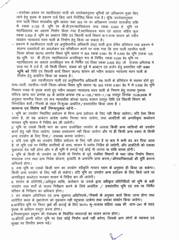 बिसाहू दास महंत कॉलेज पाली की जगह पर कोर्ट भवन के लिए जमीन अधिग्रहण करने के मामले में नगर पंचायत पाली ने जमीन अधिग्रहण के लिए एनओसी दी है, ना कि बीडीएम भवन की। नगर पंचायत पाली अध्यक्ष उमेश चंद्रा ने बताया कि पाली में व्यवहार न्यायालय के लिए भवन अपरिहार्य है और कोर्ट भवन बन जाने के बाद यहां के आसपास लोगों को न्याय का मंदिर मिल पाएगा, लेकिन पाली तानाखार विधानसभा क्षेत्र का पहला कॉलेज का अस्तित्व भी जरूरी है। उन्होंने बताया कि जनसरोकार से जुड़े होने के कारण कोर्ट भवन बनना जरूरी है। नगर पंचायत क्षेत्र में आने के कारण प्रशासन को एनओसी जरूरी थी, हमने जमीन के लिए एनओसी दी है, ताकि कोर्ट भवन का मार्ग प्रशस्त हो सके। उन्होंने बताया कि पाली एसडीएम से निवेदन किया गया है कि बीडीएम कॉलेज भवन को छोड़ दिया जाए, बाकी पर्याप्त जगह में कोर्ट भवन बनाया जाए। उन्होंने बताया कि वैसे भी उक्त खसरा नंबर वाली जमीन नगर पंचायत की नहीं, बल्कि राजस्व जमीन है।