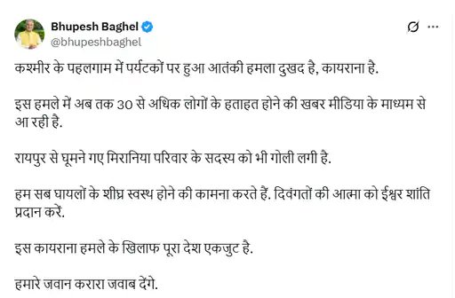 वहीं पूर्व सीएम भूपेश बघेल ने X पर लिखा कि कश्मीर के पहलगाम में पर्यटकों पर हुआ आतंकी हमला दुखद है, कायराना है। इस कायराना हमले के खिलाफ पूरा देश एकजुट है। हमारे जवान करारा जवाब देंगे।