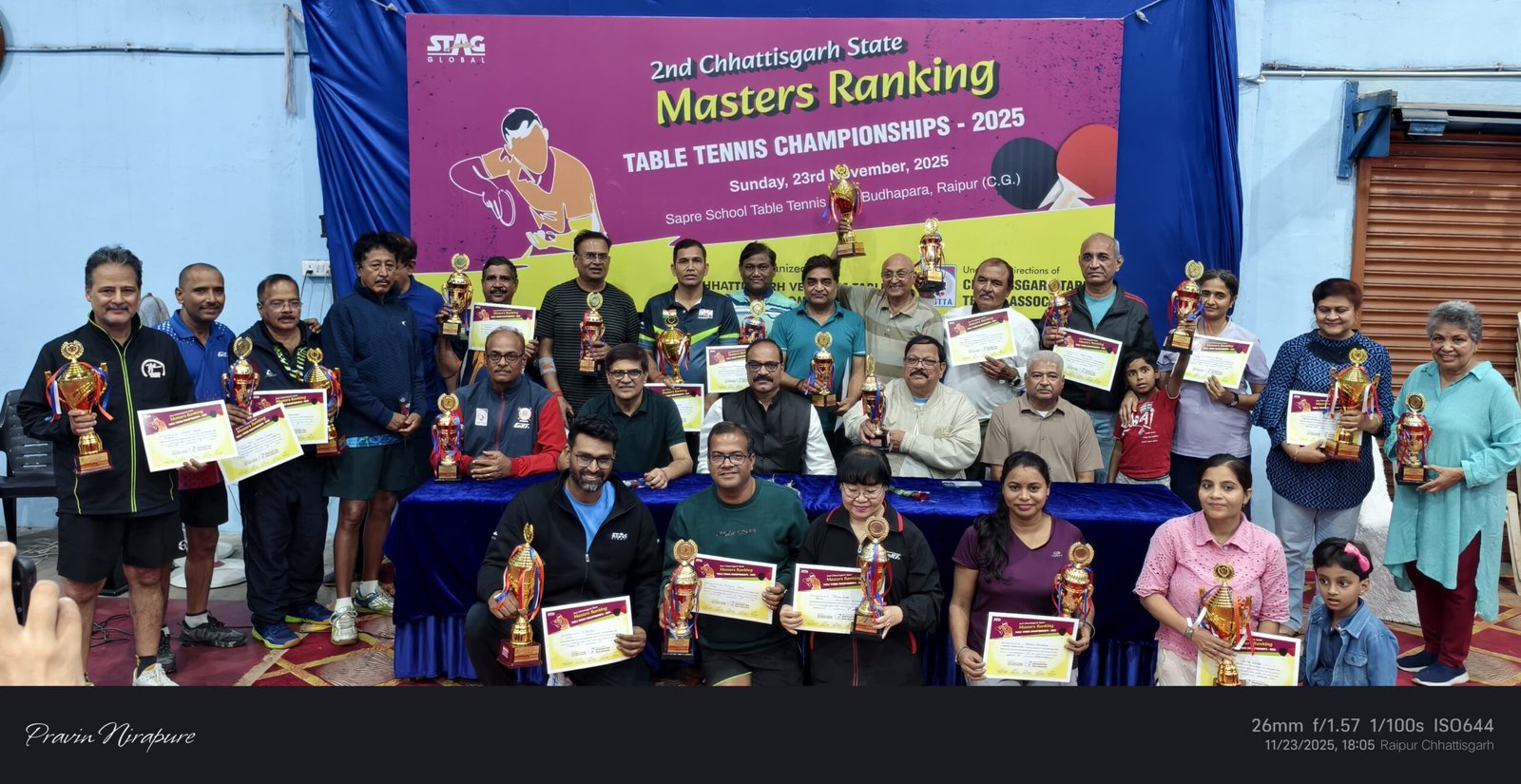 रायपुर। छत्तीसगढ़ टेबल टेनिस संघ की छत्तीसगढ़ वेटरन्स टेबल टेनिस समिति द्वारा सप्रे शाला टेबल टेनिस हाल, रायपुर में कल दिनांक 23/11/2025 को आयोजित “द्वितीय छत्तीसगढ़ राज्य मास्टर्स रैंकिंग टेबल टेनिस प्रतियोगिता 2025” संपन्न हुयी। उक्त प्रतियोगिता के सम्बन्ध में प्रतियोगिता के आयोजन सचिव प्रदीप जोशी ने जानकारी दी की प्रतियोगिता के समापन एवं पुरस्कार वितरण समारोह के मुख्य अतिथि छत्तीसगढ़ ओलंपिक संघ के उपाध्यक्ष शरद शुक्ला थे। कार्यक्रम की अध्यक्षता छत्तीसगढ़ टेबल टेनिस संघ के वरिष्ठ उपाध्यक्ष किशोर जादवानी ने किया। मंच पर छत्तीसगढ़ वेटरन टेबल टेनिस समिति के चेयरमेन प्रदीप जनवदे एवं आयोजन सचिव प्रदीप जोशी थे। मंच संचालन छत्तीसगढ़ टेबल टेनिस संघ के सह सचिव विमल नायर ने किया। प्रतियोगिता में पहली बार आयु वर्ग 50 में विनय बैसवाड़े (रायपुर), आयु वर्ग 60 में संजय लहेजा (बिलासपुर) एवं आयु वर्ग 70 में सुरजीत सेनगुप्ता (बिलासपुर) पुरुष एकल विजेता बने|
