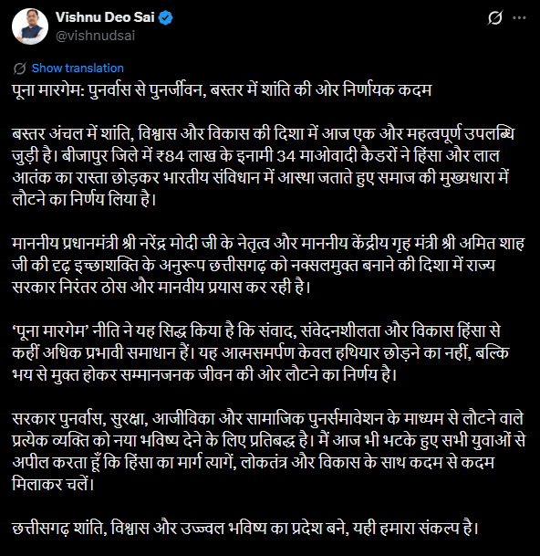 मुख्यमंत्री विष्णुदेव साय ने एक्स पर लिखा कि ‘पूना मारगेम’ नीति ने यह सिद्ध किया है कि संवाद, संवेदनशीलता और विकास हिंसा से कहीं अधिक प्रभावी समाधान हैं। यह आत्मसमर्पण केवल हथियार छोड़ने का नहीं, बल्कि भय से मुक्त होकर सम्मानजनक जीवन की ओर लौटने का निर्णय है।