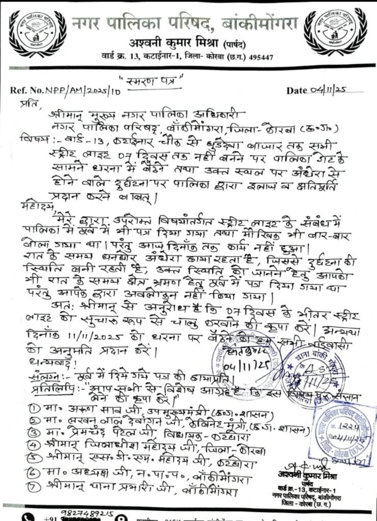 बाँकी मोगरा:– नगर पालिक परिषद बाकी मोगरा क्षेत्र अंतर्गत वार्ड क्रमांक 13 के पार्षद अश्वनी मिश्रा ने कटाईनार चौक से घुडदेवा बाजार तक सभी बंद स्ट्रीट लाइट को चालू करवाने के लिए नगर पालिक परिषद के मुख्य अधिकारी को लिखा पत्र।