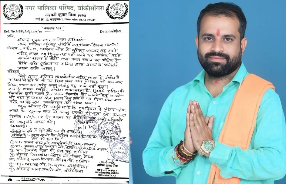 बाँकी मोगरा:– नगर पालिक परिषद बाकी मोगरा क्षेत्र अंतर्गत वार्ड क्रमांक 13 के पार्षद अश्वनी मिश्रा ने कटाईनार चौक से घुडदेवा बाजार तक सभी बंद स्ट्रीट लाइट को चालू करवाने के लिए नगर पालिक परिषद के मुख्य अधिकारी को लिखा पत्र।