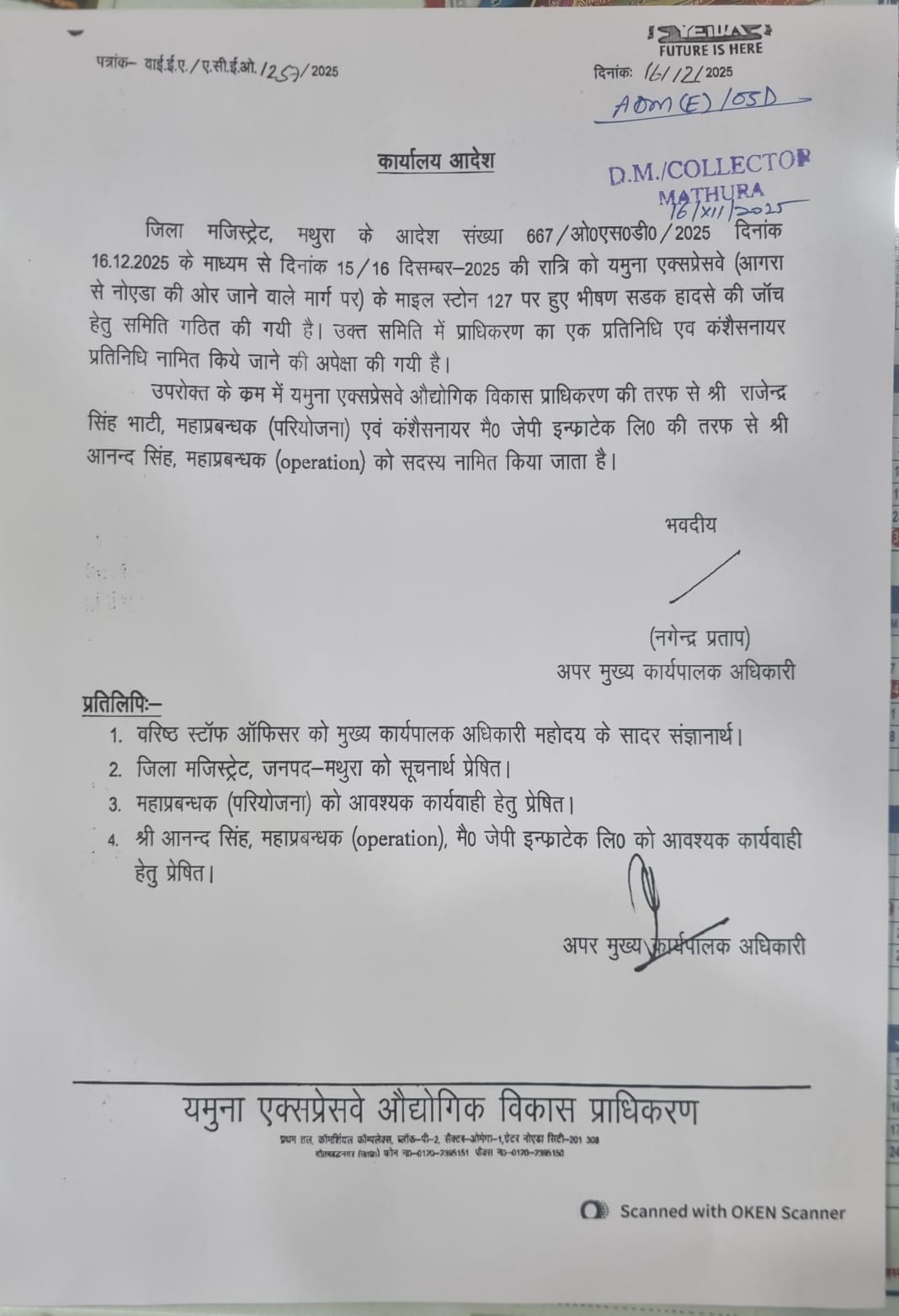 मथुरा हादसे को लेकर जिला मजिस्ट्रेट के आदेश पर गठित जांच समिति में 2 सदस्य बढ़ाए गए हैं। इसमें यमुना एक्सप्रेस-वे प्राधिकरण के परियोजना महाप्रबंधक राजेंद्र सिंह भाटी और जेपी इंफ्रा लिमिटेड महाप्रबंधक (ऑपरेशन) आनंद सिंह को भी शामिल किया गया है। इससे पहले कहा गया था कि ADM प्रशासन अमरेश जांच करेंगे।