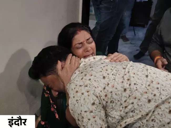 इंदौर में राजा रघुवंशी की मां से मुलाकात करता सोनम का भाई गोविंद।