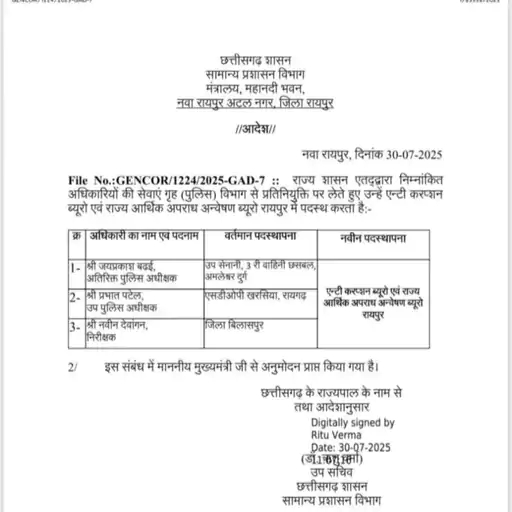 छत्तीसगढ़ में 8 IPS अफसरों का ट्रांसफर