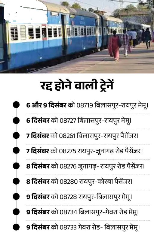 छत्तीसगढ़ में 9 ट्रेनें अगले 4 दिन कैंसिल:बिलासपुर-रायपुर-कोरबा से गुजरने वाली गाड़ियां 6 से 9 दिसंबर तक नहीं चलेंगी, तिल्दा-नेवरा सेक्शन पर पावर ब्लॉक