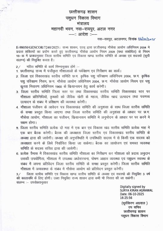 जिला और विकासखंड स्तरीय समितियों के अध्यक्ष और सदस्यों की नियुक्ति 3 साल के लिए की गई है। हालांकि, राज्य शासन को यह अधिकार रहेगा कि वह आवश्यकतानुसार किसी भी समय इन नियुक्तियों को निरस्त कर सके। यह व्यवस्था प्रशासनिक पारदर्शिता और जवाबदेही तय करने के लिए की गई है।