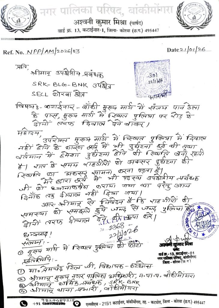 बांकी मोंगरा – जिला कोरबा के नगर पालिका परिषद बांकी मोगरा क्षेत्र अंतर्गत कटाईनार जो बांकी कोरबा मुख्य मार्ग है जिसपर बने पुल पर दोनों तरफ किसी तरह की कोई भी सुरक्षा नहीं है पूरी तरह से खुले होने के वजह से वह क्षेत्र किसी बड़ी अप्रिय घटना को निमंत्रण देने जैसी है।