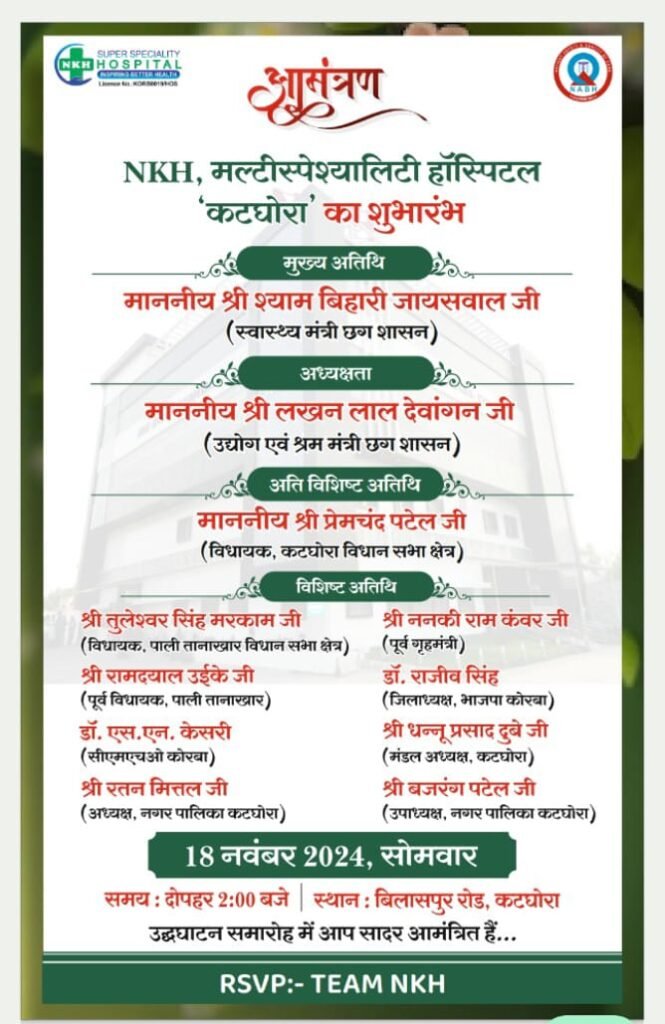 कोरबा। कोरबा जिलावासियों को बेहतर और महानगरीय तर्ज पर उपचार सुविधा उपलब्ध करा रहा रहे एनकेएच ग्रुप द्वारा एनकेएच, मल्टीस्पेश्यालिटी हॉस्पिटल (कटघोरा) का शुभारंभ 18 नवंबर से किया जा रहा है।