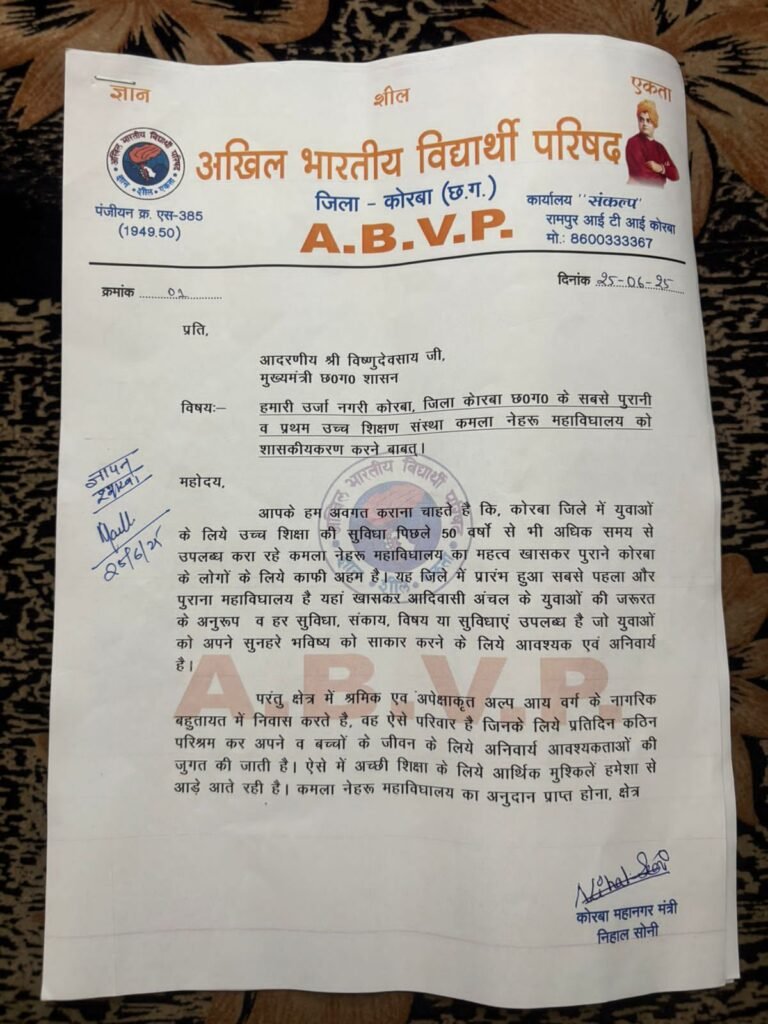 कोरबा। अखिल भारतीय विद्यार्थी परिषद (अभाविप) के कार्यकर्ताओं ने कमला नेहरू महाविद्यालय, कोरबा को शासकीय घोषित किए जाने की मांग को लेकर मंगलवार को अपर कलेक्टर को ज्ञापन सौंपा।