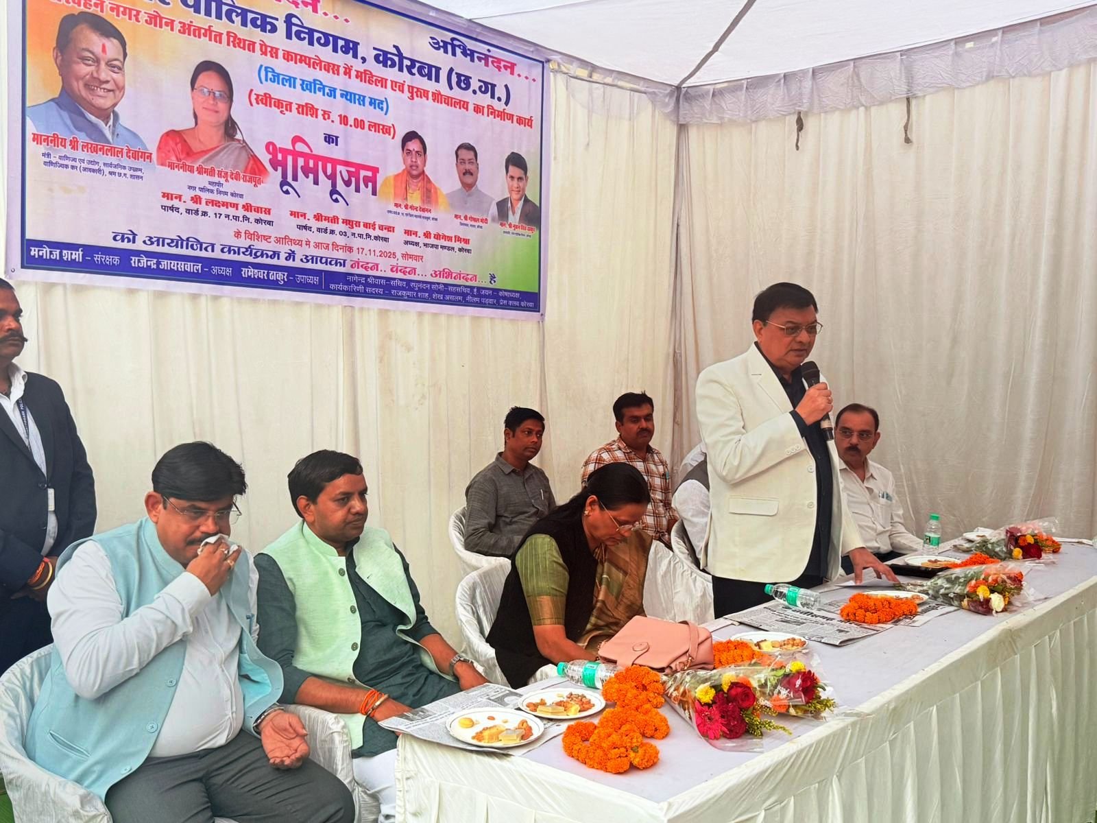 कोरबा। प्रदेश के कैबिनेट मंत्री लखनलाल देवांगन ने टी.पी. नगर स्थित प्रेस काम्पलेक्स में जिला खनिज न्यास मद से 10 लाख रूपये की लागत से महिला एवं पुरूष शौचालय के मरम्मत कार्य का भूमिपूजन किया। बतौर मुख्य अतिथि की आसंदी से कार्यक्रम को सम्बोधित करते हुए कहा कि भाजपा का सुशासन आने के बाद अब तक 800 करोड़ से अधिक का विकास कार्य चल रहा है। उन्होंने कहा कि हमारी प्राथमिकता सबसे पहले सड़क को दुरूस्त करना है, इसके अलावा बुनियादी आवश्यकताओं को पूरी की जा रही है, ताकि जनता की सुविधा बढ़े। कार्यक्रम की अध्यक्षता महापौर श्रीमती संजूदेवी राजपूत ने की।
