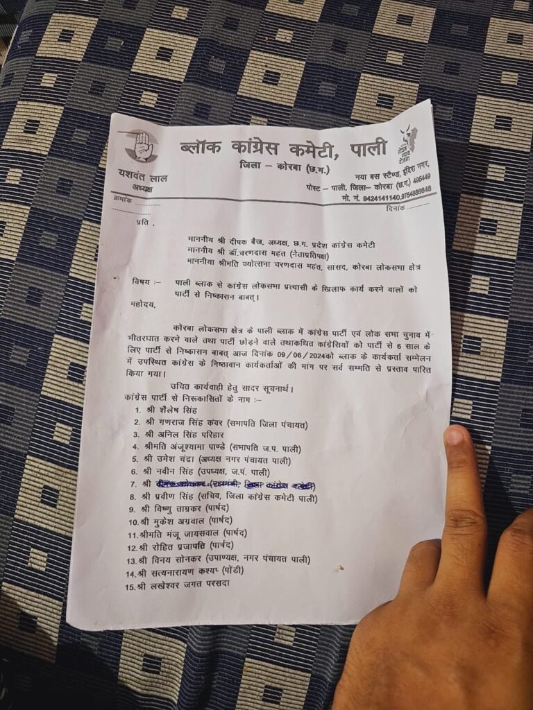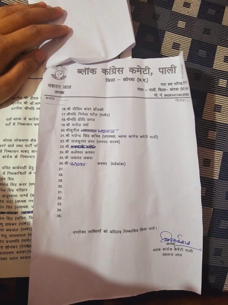 कोरबा लोकसभा क्षेत्र के पाली ब्लाक में कांग्रेस पार्टी एवं लोकसभा चुनाव में भीतरघात करने वाले तथा पार्टी छोडऩे वाले तथाकथित कांग्रेसियों को पार्टी से 6 साल के लिए निष्कासित कर दिया गया है। ब्लाक कांग्रेस कमेटी अध्यक्ष यशवंत लाल ने उक्ताशय का पत्र पार्टी अध्यक्ष दीपक बैज, डॉ. चरणदास महंत एवं सांसद श्रीमती ज्योत्सना महंत को भी प्रेषित किया है। आज केराझरिया में आयोजित काग्रेस कार्यकर्ता सम्मेलन में निष्ठावान कार्यकर्ताओं की मांग पर सर्वसम्मती से यह प्रस्ताव पास किया गया और तथा कथित कांग्रेस नेताओं को 6 साल के लिए निष्कासित किया गया है। निष्कासित होने वाले नेताओं में शैलेष सिंह, जिला पंचायत सदस्य गणराज सिंह कंवर, अनिल सिंह परिहार, जनपद सदस्य अंजू श्यामा पांडेय, नगर पंचायत अध्यक्ष उमेश चंद्रा, जनपद उपाध्यक्ष नवीन सिंह ठाकुर, प्रवीण सिंह, पार्षद विष्णु ताम्रकर, पार्षद मुकेश अग्रवाल, पार्षद मंजू जायसवाल, पार्षद रोहित प्रजापति, नगर पंचायत उपाध्यक्ष विनय सोनकर, सत्यनारायण कश्यप, लखेश्वर जगत, दिलीप कंवर, निर्मला पटेल, प्रीति जगत, मनोज वर्मा, सुनील अग्रवाल, गजेन्द्र सिंह, राजकुमार तंवर, कलेश्वर कश्यप, जसवंत लकरा, दशरथ कश्यप सहित अन्य कार्यकर्ता शामिल हैं। इन्हें 6 साल के लिए पार्टी से निष्कासित किया गया है।