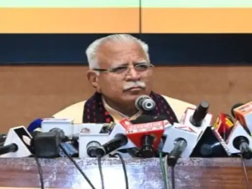 मंत्री मनोहर लाल खट्टर मीडिया को जानकारी देते हुए।
