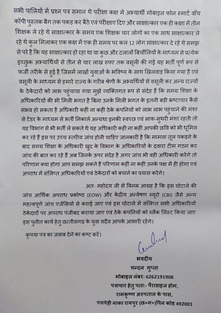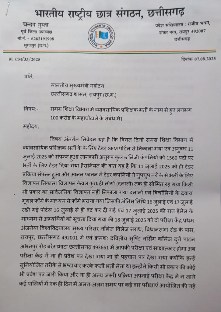 रायपुर। एनएसयूआई के पूर्व जिला उपाध्यक्ष चन्दन गुप्ता ने समग्र शिक्षा विभाग में व्यवसायिक प्रशिक्षक भर्ती में लगभग 100 करोड़ के महाघोटाले के संबंध में मुख्यमंत्री को पत्र लिखा है। चन्दन गुप्ता ने आरोप लगाया कि विगत दिनों समग्र शिक्षा विभाग में व्यवसायिक प्रशिक्षक भर्ती के लिए टेंडर GEM पोर्टल से निकाला गया एवं अनुबंध 11 जुलाई 2025 को संपन्न हुआ। जानकारी अनुरूप कुल 6 निजी कंपनियों को 1560 पदों पर भर्ती के लिए टेंडर दिया गया। हैरानियत की बात यह है कि 11 जुलाई 2025 को ही टेंडर प्रक्रिया संपन्न हुआ और आनन-फानन में टेंडर कंपनियों ने गुपचुप तरीके से भर्ती के लिए विज्ञापन निकाला। विज्ञापन केवल कुछ ही लोगों (दलालों) तक ही सीमित रह गया। किसी भी प्रकार का सार्वजनिक विज्ञापन नहीं निकाला गया। दलालों एवं बिचौलियों द्वारा गूगल फॉर्म के माध्यम से फॉर्म भराया गया, जिसकी अंतिम तिथि 16 जुलाई एवं 17 जुलाई रखी गई। पोर्टल 16 जुलाई से ही बंद कर दी गई एवं 17 जुलाई 2025 की रात ईमेल के माध्यम से अभ्यर्थियों को सूचना दी कि 18 जुलाई 2025 को दो परीक्षा केंद्र प्रथम अंजनेया विश्वविद्यालय मुख्य परिसर नॉलेज विलेज नराध, विधानसभा रोड के पास, रायपुर, छत्तीसगढ़ 492001 में एवं क्रमशः द्वितीय सृष्टि नर्सिंग कॉलेज दुर्ग पाटन अभनपुर रोड बरेंगाभाटा। छत्तीसगढ़ 493661 में आपकी परीक्षा एवं साक्षात्कार होगा। अब परीक्षा केंद्र में ना ही प्रवेश पत्र देखा गया ना ही पहचान पत्र देखा गया क्योंकि इन्हें सुनियोजित तरीके से भ्रष्टाचार करके फर्जी भर्ती लेना था। इन्होंने किसी भी प्रकार की कोई भी प्रवेश पत्र जारी नही किया और ना ही अन्य जरूरी प्रक्रिया अपनाई। परीक्षा केंद्र में न जाने कई पालियों में एक ही दिन में अलग-अलग समय पर कई बार परीक्षाएं आयोजित की गई। सभी पालियों में प्रश्न पत्र समान थे। परीक्षा कक्ष में अभ्यार्थी मोबाइल फोन, स्मार्ट वॉच, कॉपी, पुस्तक, बैग तक पकड़ कर बैठे एवं परीक्षाए´ दि और साक्षात्कार एक ही कक्षा में तीन शिक्षक ले रहे थे। साक्षात्कार के समय एक शिक्षक चार लोगों का एक साथ साक्षात्कार ले रहे थे । कुल मिलाकर एक कक्ष में एक ही समय पर 12 लोग साक्षात्कार दे रहे थे, समझ से परे है कि यह साक्षात्कार हो रहा था या कुछ और। दलालों-बिचौलियों के माध्यम से प्रत्येक इच्छुक अभ्यार्थियों से तीन से चार लाख रुपए तक वसूली की गई। यह भर्ती पूर्ण रूप से फर्जी तरीके से हुई है, जिसमें लाखों युवाओं के भविष्य के साथ खिलवाड़ किया गया है एवं वसूली के माध्यम से हमारे राज्य के गरीब श्रेणी के अभ्यर्थियों से वसूली कर अन्य राज्यों के ठेकेदारों को लाभ पहुंचाया गया। मुझे व्यक्तिगत रूप से संदेह है कि समग्र शिक्षा के अधिकारियों की भी मिली भगत है। उनके मिली भगत के बिना इत