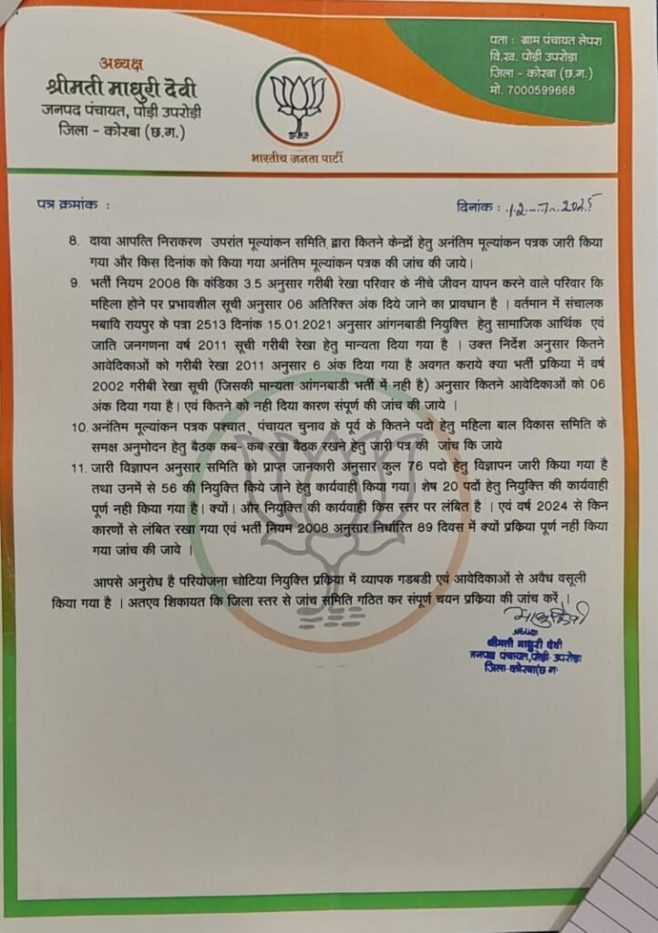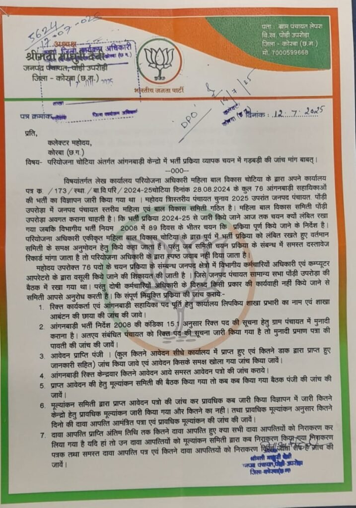 महिला एवं बाल विकास परियोजना चोटिया में आंगनबाड़ी भर्ती में भ्रष्टाचार का आरोप, जनपद पोड़ी-उपरोड़ा अध्यक्ष माधुरी तंवर ने कलेक्टर को सौंपा ज्ञापन, जांच की मांग
