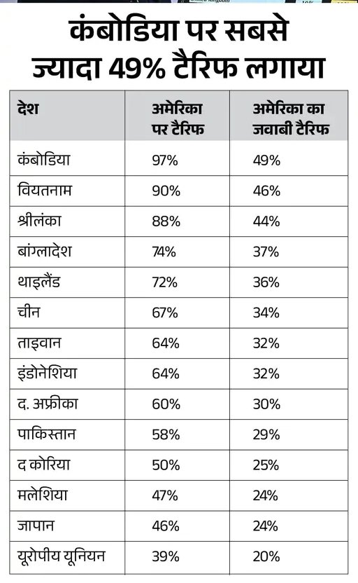 भारत के अलावा चीन पर 34%, यूरोपीय यूनियन पर 20%, साउथ कोरिया पर 25%, जापान पर 24%, वियतनाम पर 46% और ताइवान पर 32% टैरिफ लगेगा। अमेरिका ने करीब 60 देशों पर उनके टैरिफ की तुलना में आधा टैरिफ लगाने का फैसला किया है।