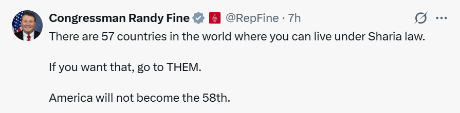Divya Akashवॉशिंगटन डीसी,एजेंसी। अमेरिकी सांसद रैंडी फाइन के एक सोशल मीडिया पोस्ट से बड़ा विवाद खड़ा हो गया है। उन्होंने मंगलवार को X पर लिखा कि अगर कुत्तों और मुसलमानों में से एक को चुनना पड़े तो यह मुश्किल फैसला नहीं है।