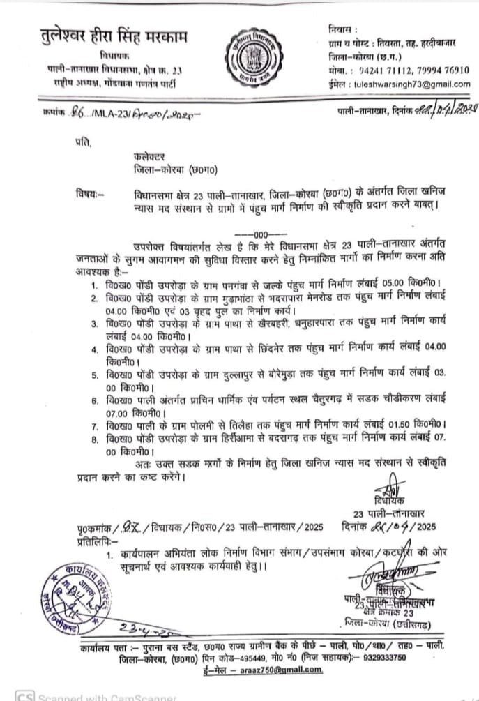 कोरबा/पाली/तानाखार। पाली तानाखार विधानसभा क्षेत्र के विधायक तुलेश्वर सिंह मरकाम ने सुशासन तिहार पर कलेक्टर को पत्र लिखकर ग्रामीण क्षेत्र की सडक़ों एवं पुल पुलिया निर्माण के लिए डीएमएफ से राशि की मांग की थी, जिस पर कलेक्टर अजीत बसंत ने त्वरित स्वीकृति देते हुए क्षेत्र के विकास को रफ्तार देने का प्रयास किया और विधायक श्री मरकाम की जनहितैषी मांग को स्वीकृत की।