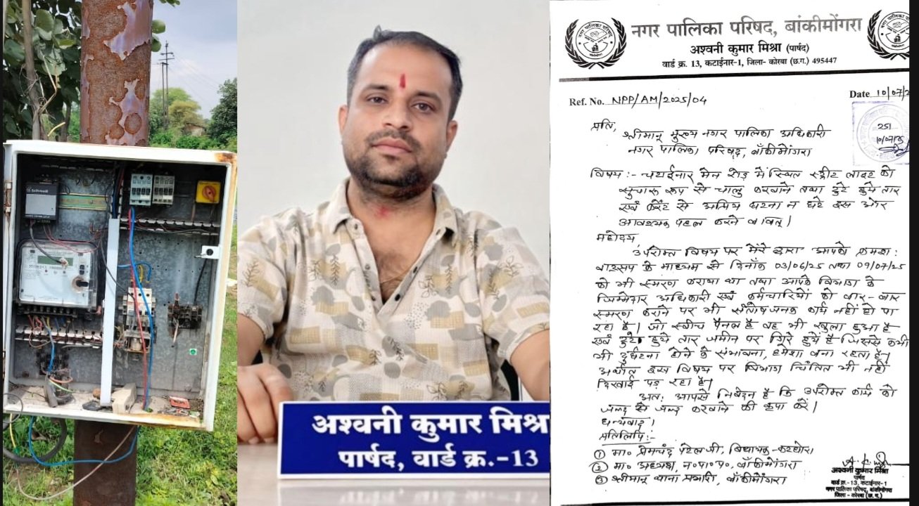 इसी का ध्यान रखते हुए नगर पालिका परिषद बांकीमोंगरा मुख्य पालिका अधिकारी को वार्ड क्रमांक 13 कटाईनार-1 के पार्षद अश्वनी कुमार मिश्रा ने ज्ञापन सौंपकर चटाईनार मेन रोड़ स्थित में बंद पड़े स्ट्रीट लाइट को चालू कराने व टुटे हुए लाइन तार को हटवाने की मांग कि है। पार्षद मिश्रा ने ज्ञापन सौंपकर कहां कि मेरे द्वारा पालिका के सीएमओ को क्रमश वाट्सअप के माध्यम से दिनांक 03/06/2025 को एवं 09/07/2025 को भी स्मरण कराया था व आपके विभाग के जिम्मेदार अधिकारी एवं कर्मचारियों को बार-बार अवगत कराने के बाद भी संतोषजनक कार्य नहीं हो पा रहा है। जो स्वीज पैनल है वह भी खुला हुआ है , इसके अलावा टुटे हुए लाईन तार जमीन पर गिरे हुए जिससे कभी भी बड़ी दुर्घटना होने की संभावना बनी हुई है । पार्षद ने इस विषय पर व दिये गये ज्ञापन को गंभीरता पूर्वक संज्ञान में लेते हुए दिये गये शिकायत कि समस्या को जल्द से जल्द निराकरण कराने की आग्रह किया है।