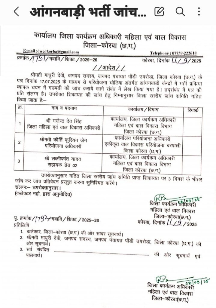 कोरबा/चोटिया। महिला एवं बाल विकास विभाग परियोजना चोटिया में आंगनबाड़ी भर्ती घोटाला के आरोप को कलेक्टर ने गंभीरता से लिया और कुछ दिन पूर्व जांच के आदेश दिए थे, जिस पर जिला कार्यक्रम अधिकारी श्रीमती रेणु प्रकाश ने तीन सदस्यीय जांच टीम का गठन किया है और जांच टीम को समयावधि में रिपोर्ट पेश करने का निर्देश दिया है।