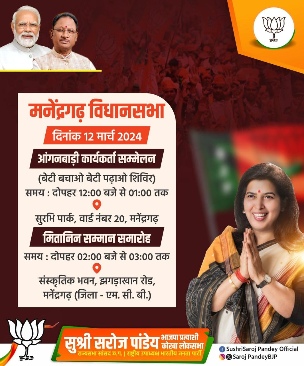 कोरबा/मनेन्द्रगढ़। भारतीय जनता पार्टी ने राष्ट्रीय स्तर की ख्यातिलब्ध समाज सेविका एवं भाजपा नेत्री पूर्व सांसद, पूर्व विधायक, पूर्व महापौर तथा भाजपा की राष्ट्रीय उपाध्यक्ष, राज्य सभा सांसद एवं प्रखर वक्ता सुश्री सरोज पाण्डेय को कोरबा लोकसभा क्षेत्र से प्रत्याशी बनाए जाने के बाद सुश्री पाण्डेय ने लोकसभा क्षेत्र के सभी विधानसभा क्षेत्रों में धुंआधार दौरा करने के साथ-साथ लगातार कई कार्यक्रम आयोजित कर जनता को रूझाने में लगे हुए हैं। आज दोपहर 12 बजे मनेन्द्रगढ़ विधानसभा क्षेत्र में बेटी बचाओ-बेटी पढ़ाओ शिविर में आंगनबाड़ी कार्यकर्ता सम्मेलन रखा गया है। शिविर का आयोजन सुरभिपार्क, वार्ड क्र.-20 मनेन्द्रगढ़ में आयोजित है। यह कार्यक्रम 12 बजे से 1:00 बजे तक आयोजित है, इसी तरह दोपहर 2 बजे से अपरान्ह 3:00 बजे तक मितानिन सम्मान समारोह का आयोजन किया जा रहा है। उक्त सम्मान समारोह सांस्कृतिक भवन झगड़ाखान रोड मनेन्द्रगढ़ में रखा गया है। कार्यक्रम की अध्यक्षता मनेन्द्रगढ़ विधायक एवं केबिनेट मंत्री श्याम बिहारी जायसवाल सहित जिले के वरिष्ठ पदाधिकारी, कार्यकर्ता उपस्थित रहेंगे। बताया जा रहा है कि सुश्री सरोज पाण्डेय को जिताने के लिए पूरा लोकसभा क्षेत्र के भाजपा कार्यकर्ता एकजूट होकर संकल्प के साथ आगे बढ़ रहे हैं। सुश्री सरोज पाण्डेय ने कहा कि मोदी की गारंटी से प्रदेश विकास की नई ऊंचाईयां छुएगा और विष्णु का सुशासन सबको समृद्धि और खुशहाली देगा।