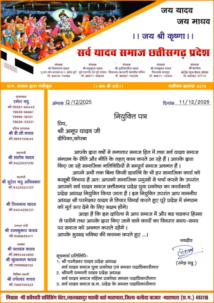 सर्व यादव समाज छत्तीसगढ़ के प्रांताध्यक्ष रमेश यदु ने इस आशय का पत्र अनुप यादव को सौंपा है और पत्र में लिखा है कि आपके द्वारा बिना पद लिए सर्व यादव समाज के लिए कई बड़े-बड़े हित के कार्य किए गए और संगठन को मजबूत करने की दिशा में अथक प्रयास किया जाता रहा है। आपके द्वारा किए गए सामाजिक गतिविधियों से संपूर्ण समाज अवगत है, इसे दृष्टिगत रखते हुए आपको युवा प्रकोष्ठ का कार्यकारी प्रदेश अध्यक्ष बनाया जाता है।