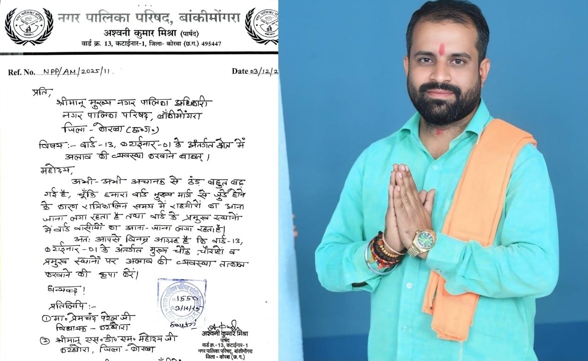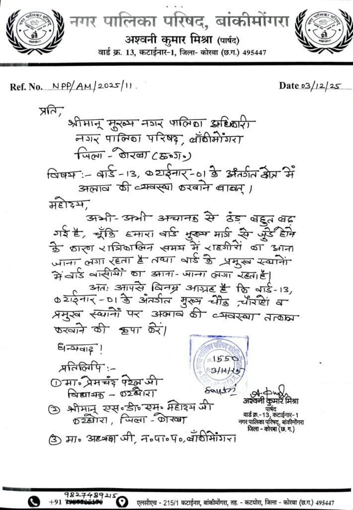 अश्वनी मिश्रा ने मुख्य अधिकारी को पत्र के माध्यम से अवगत कराया कि अभी-अभी अचानक से ठंड बहुत बढ़ गई है, चूँकि हमारा वार्ड मुख्य मार्ग से जुड़े होने के कारण रात्रिकालिन समय में राहगीरों का आना जाना लगा रहता है तथा वार्ड के प्रमुख स्थानों चौक चौहराहो में वार्ड वासीयों का आना-जाना लगा रहता है। वार्ड के निवासी जन – प्रशासन से चौक-चौराहों पर अलाव की व्यवस्था कराने की मांग कर रहे हैं।