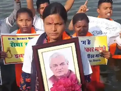 रायपुर,एजेंसी। नवा रायपुर के तूता धरना स्थल पर B.Ed अभ्यर्थी सहायक शिक्षक अपनी नौकरी बचाने के लिए पिछले 12 दिनों से आंदोलन कर रहे हैं। इस बीच अभ्यर्थियों ने पूर्व प्रधानमंत्री अटल बिहारी वाजपेयी की तस्वीर लेकर जल सत्याग्रह किया।