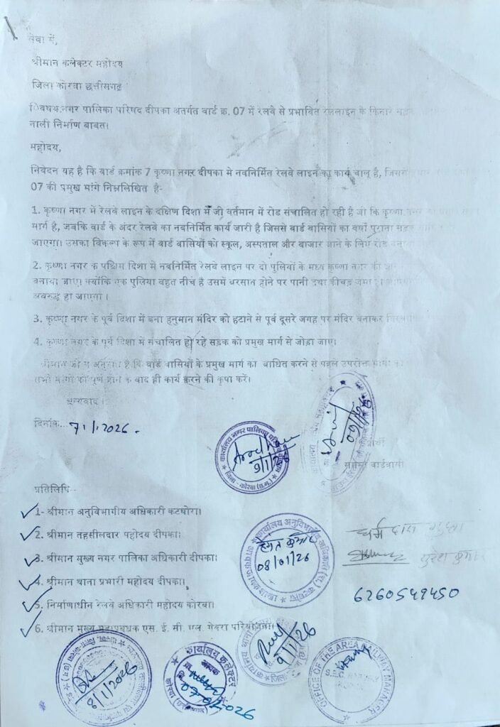 कोरबा/दीपका। नगर पालिका परिषद दीपका के वार्ड क्रमांक 07 कृष्ण नगर के निवासियों ने क्षेत्र में चल रहे रेलवे लाइन विस्तार कार्य के कारण उत्पन्न हो रही समस्याओं को लेकर गहरी चिंता व्यक्त की है। वार्डवासियों ने जिला कलेक्टर कोरबा को एक औपचारिक मांग पत्र सौंपकर रेलवे लाइन के किनारे सड़क, नाली निर्माण और धार्मिक स्थल के विस्थापन को लेकर चार प्रमुख मांगें रखी हैं ।