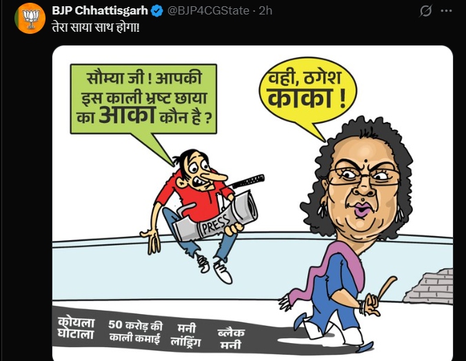 भाजपा के सोशल मीडिया अकाउंट से साझा किए गए कार्टून में सौम्या चौरसिया को चलते हुए दिखाया जा रहा है। इस कार्टून में उनके पीछे परछाई, जिसमें ठगेश काका नाम लिखा है। वहीं दूसरे कार्टून में पांच व्यक्ति दिख रहे हैं और पेटी में कांग्रेस का घोटाला बम लिखा हुआ है। आसमान में आतिशबाजी दिख रही है और उसमें कांग्रेस सरकार के कथित घोटाला का नाम लिखा है।