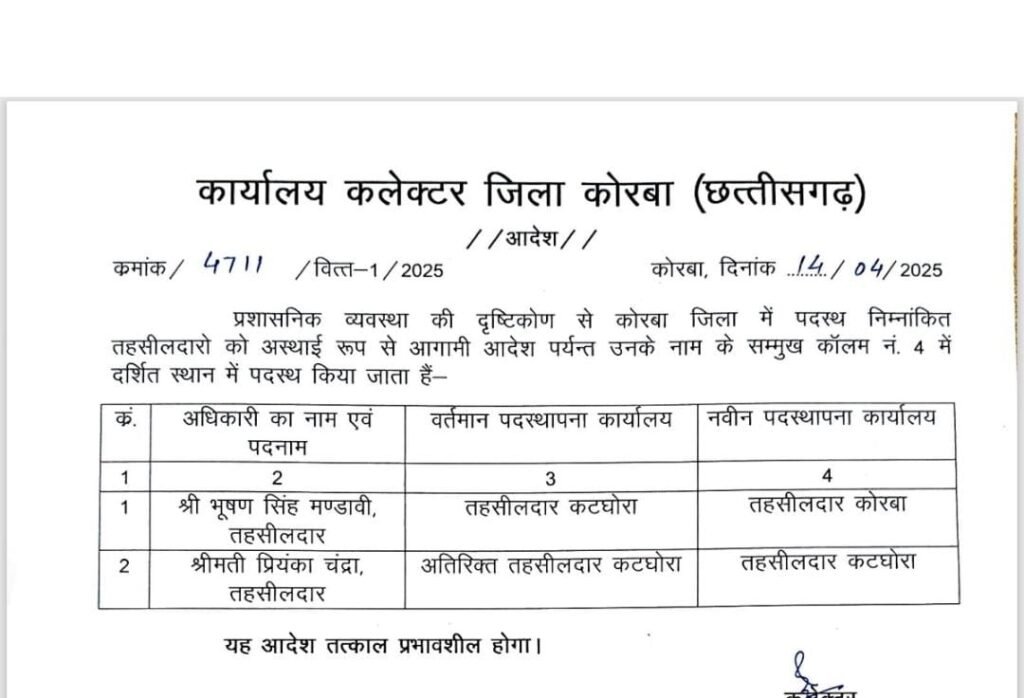 भूषण सिंह कोरबा तहसीलदार एवं प्रियंका चंद्रा कटघोरा तहसीलदार बनीं
