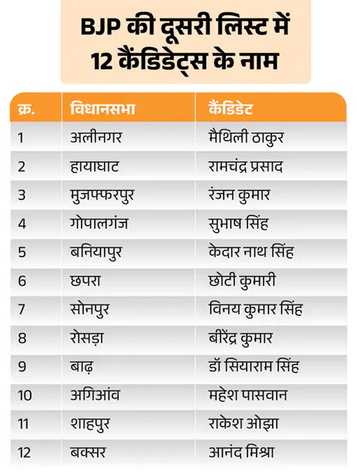 बिहार चुनाव- BJP की दूसरी लिस्ट जारी, 12 नाम:एक दिन पहले पार्टी जॉइन करने वाली मैथिली ठाकुर को टिकट, बक्सर से पूर्व IPS आनंद मिश्रा को उतारा
