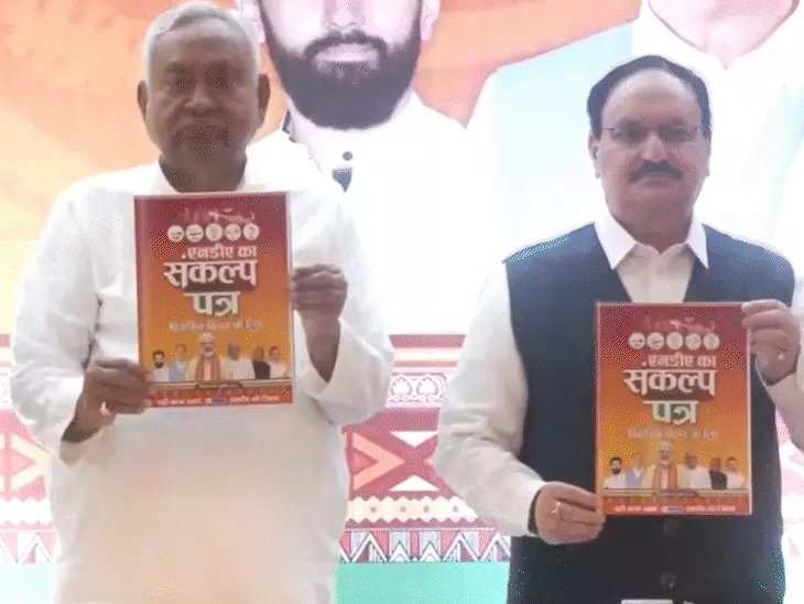 पटना के होटल मौर्या में केंद्रीय मंत्री और भाजपा के राष्ट्रीय अध्यक्ष जेपी नड्डा, मुख्यमंत्री नीतीश कुमार, केंद्रीय मंत्री और HAM(S) नेता जीतन राम मांझी, केंद्रीय मंत्री और LJP-रामविलास के राष्ट्रीय अध्यक्ष चिराग पासवान, RLM के राष्ट्रीय अध्यक्ष उपेंद्र कुशवाहा ने घोषणा पत्र जारी किया।