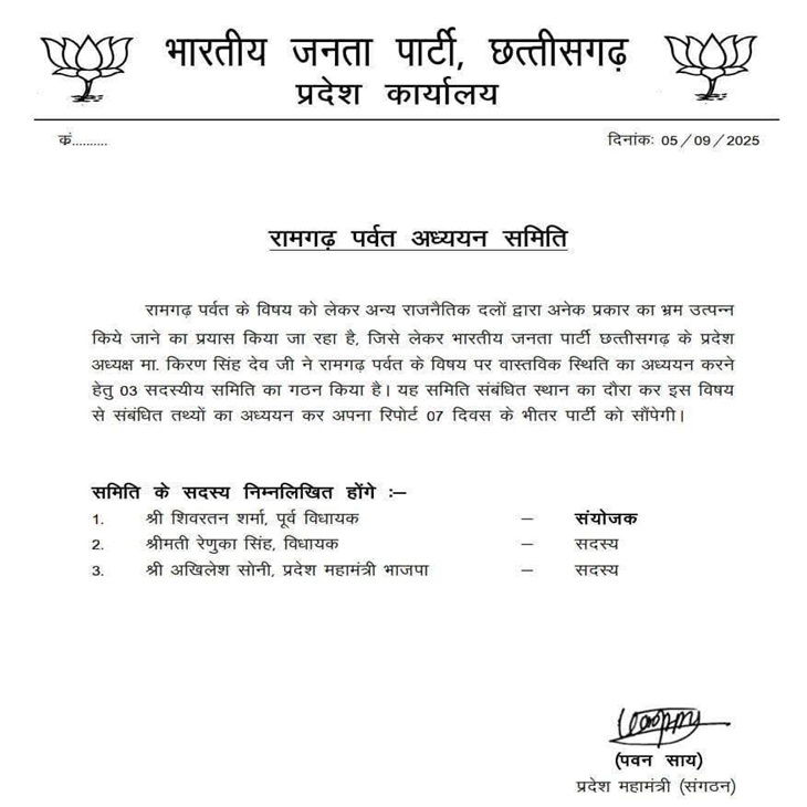 रामगढ़ पर अध्ययन के लिए भाजपा की ओर से बनाई गई समिति में पूर्व विधायक शिवरतन शर्मा, भरतपुर-सोनहत विधायक रेणुका सिंह और भाजपा प्रदेश महामंत्री अखिलेश सोनी शामिल हैं। पूर्व डिप्टी सीएम ने 2 सितंबर को मुख्यमंत्री विष्णुदेव साय को 6 पन्नों की चिट्ठी खिली थी।