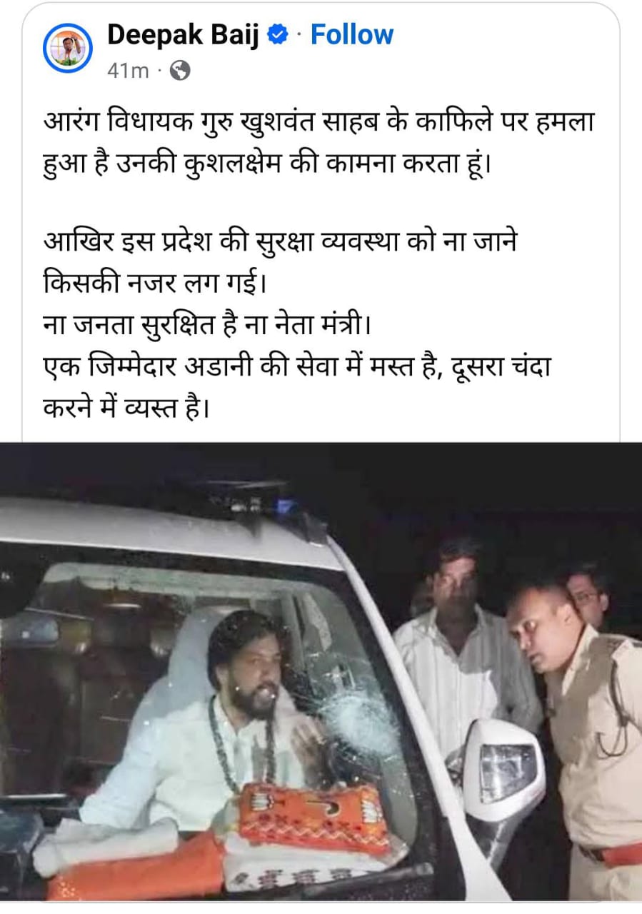 वहीं पथराव को लेकर छत्तीसगढ़ कांग्रेस के प्रदेश अध्यक्ष दीपक बैज ने कहा कि आरंग विधायक गुरु खुशवंत साहब के काफिले पर हमला हुआ है। उनकी कुशलक्षेम की कामना करता हूं। आखिर इस प्रदेश की सुरक्षा व्यवस्था को ना जाने किसकी नजर लग गई।