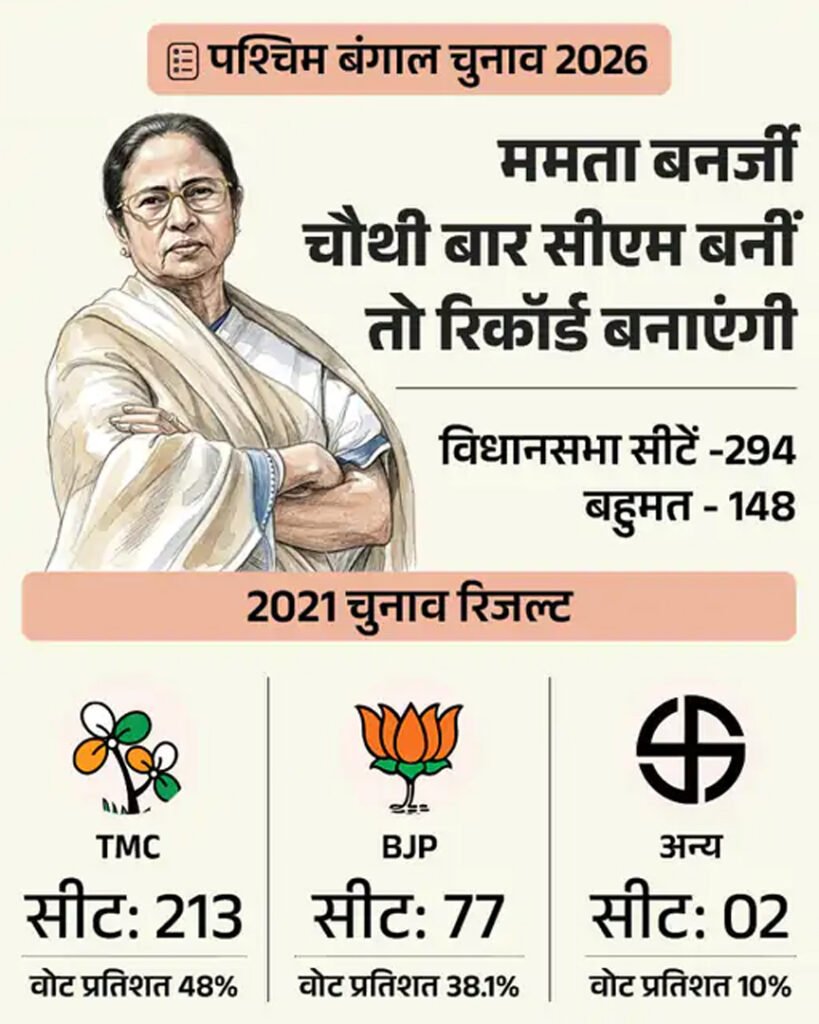 14 साल से CM ममता के सामने BJP मुख्य चुनौती है। 2026 के चुनाव में टीएमसी जीती तो ममता बनर्जी लगातार चौथी बार मुख्यमंत्री बनेंगी। वे ऐसा करने वाली देश पहली महिला होंगी। जयललिता के नाम 5 बार तमिलनाडु की मुख्यमंत्री बनने का रिकॉर्ड है। हालांकि, वह 1991 से 2016 तक अलग-अलग कार्यकाल (लगातार नहीं) में मुख्यमंत्री पद पर रहीं।