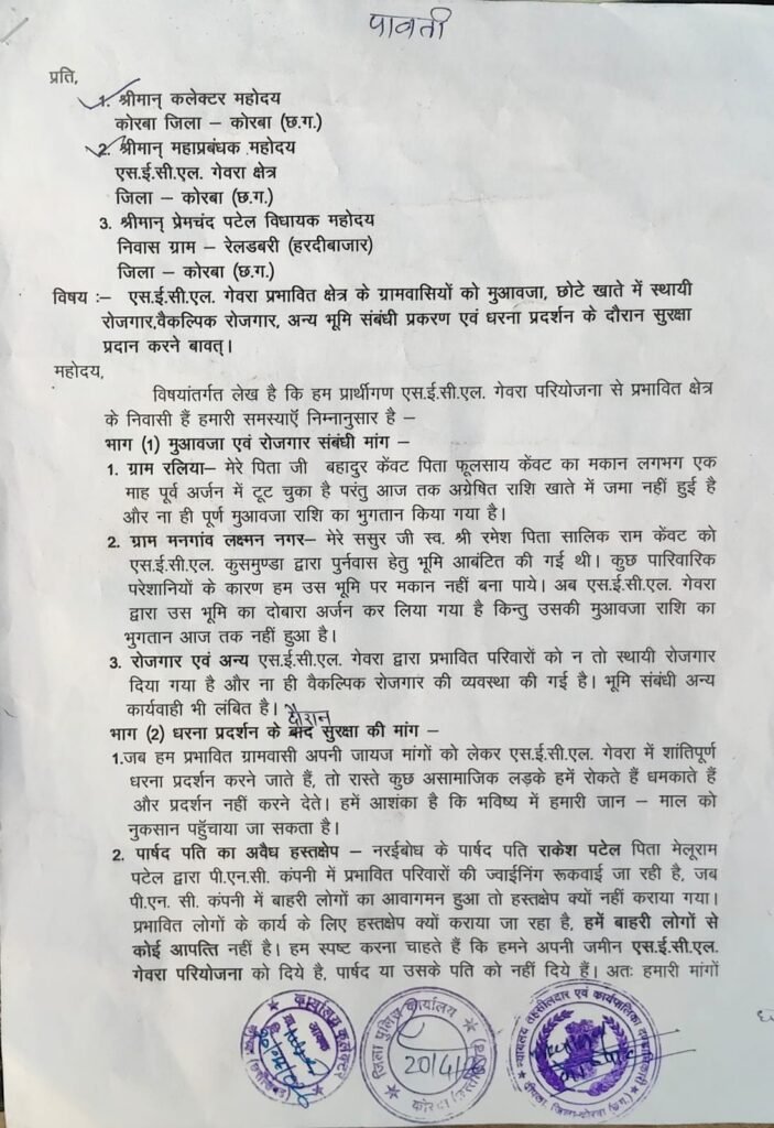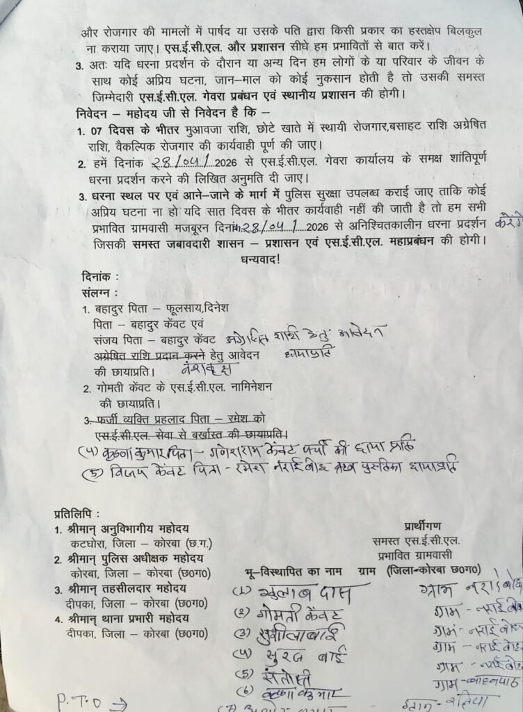 कोरबा/गेवरा। एस.ई.सी.एल. (SECL) गेवरा परियोजना से प्रभावित ग्राम रलिया, मनगांव, लक्ष्मण नगर और नरईबोध के ग्रामीणों ने प्रशासन और प्रबंधन के खिलाफ मोर्चा खोल दिया है। सोमवार को कलेक्टर, विधायक और एसईसीएल महाप्रबंधक को सौंपे गए एक ज्ञापन में ग्रामीणों ने अपनी गंभीर समस्याओं को साझा करते हुए चेतावनी दी है कि यदि 7 दिनों के भीतर उनकी मांगें पूरी नहीं हुईं, तो 28 अप्रैल 2026 से वे गेवरा कार्यालय के समक्ष उग्र और अनिश्चितकालीन प्रदर्शन करेंगे ।