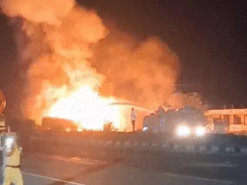 केमिकल से भरे टैंकर का तापमान कम करने के लिए लगातार पानी डाला गया।