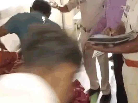 घटना के बाद शव अस्पताल लाया गया, जहां जांच करती हुई पुलिस।