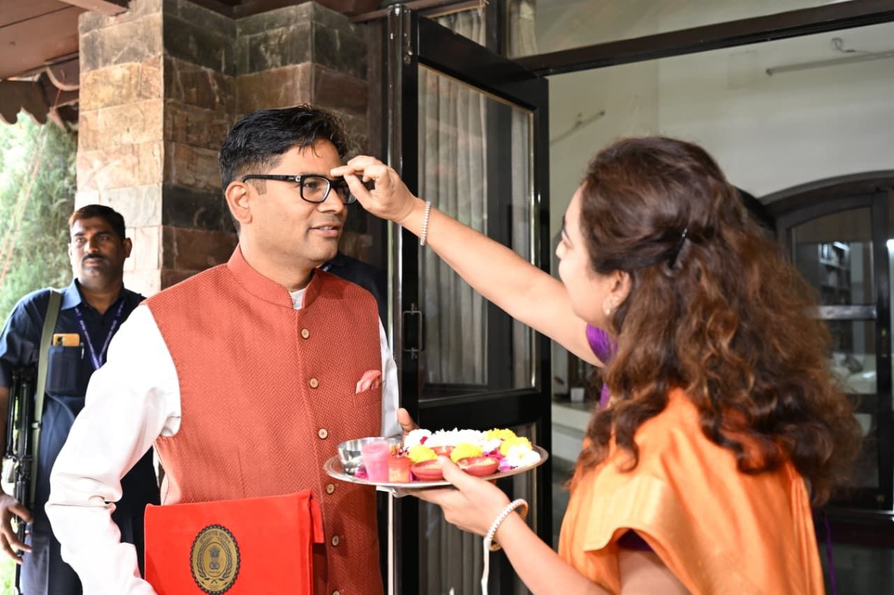 बजट पेश करने से पहले मंत्री ओपी चौधरी को उनकी पत्नी अदिति ने माटी का तिलक लगाकर रवाना किया।